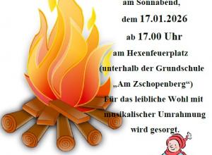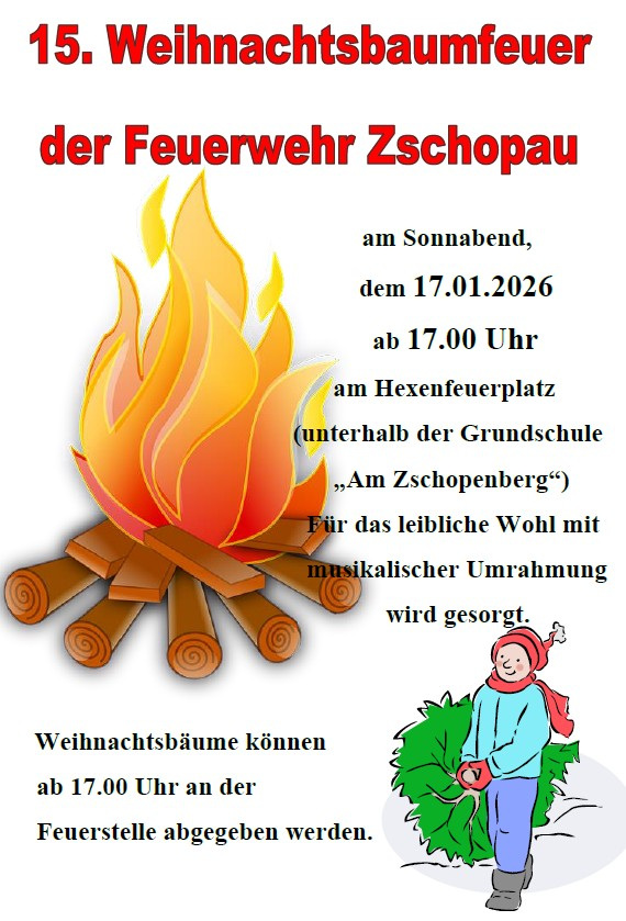 Am Sonnabend, dem 17.01.2026 ab 17.00 Uhr lädt die Feuerwehr Zschopau zum 15. Weihnachtsbaumfeuer am Hexenfeuerplatz (unterhalb der Grundschule „Am Zschopenberg“) ein.