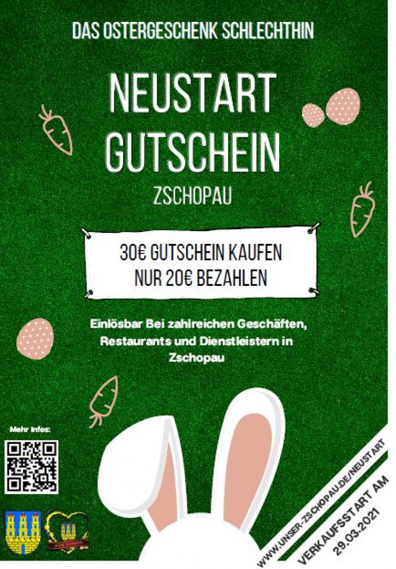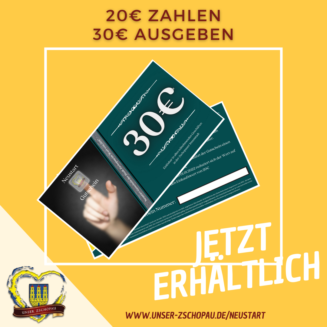Um die Zschopauer Gewerbetreibenden nach der langen Zeit des Lockdowns zu unterstützen, startet der Gewerbeverein Unser Zschopau e. V. ab Montag, den 29.03.2021, eine Gutscheinaktion. Die Neustart-Gutscheine sind für 20 Euro erhältlich, haben bei Einlösung in einem teilnehmenden Geschäft, Restaurants und Dienstleister im Stadtgebiet dann aber einen Warenwert von 30 Euro.